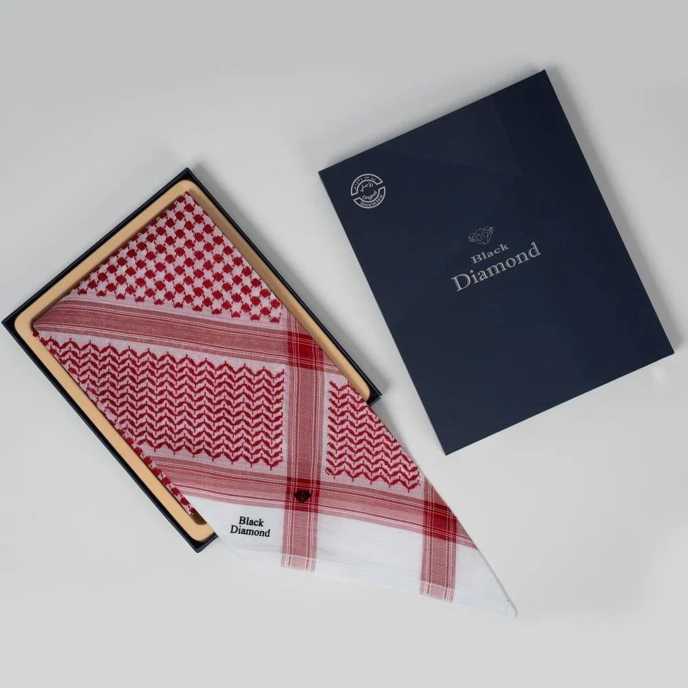 يعتمد التصميم على توزيع لوني احترافي يبرز تفاصيل النقشة بوضوح، مع خامة قطنية خفيفة وانسيابية تساعد على الثبات والمحافظة على ترتيب الشماغ طوال فترة الارتداء.